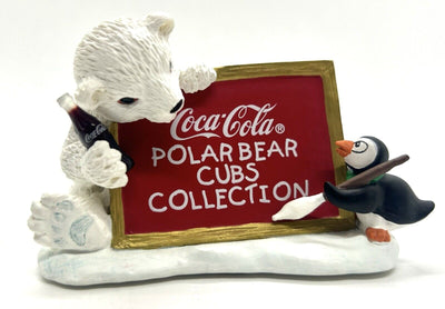 This Coca-Cola figurine features adorable polar bear cub painting a sign with a penguin friend. The colorful multi-color design is perfect for collectors. Made in 1996, this figurine is an original piece and a must-have for Coca-Cola enthusiasts. With a focus on the brand and theme rather than the condition, this collectible item is perfect for display in any home or office. It's a great addition to any Coca-Cola or soda-themed collection and is sure to bring a smile to everyone's face. Don't miss out on the chance to own this unique and charming figurine