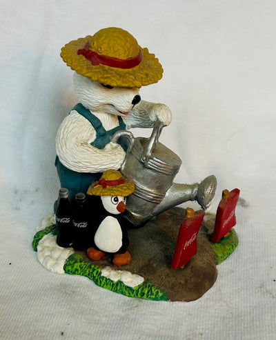 This Coca-Cola figurine features adorable polar bear cub and penguin watering the garden. The colorful multi-color design is perfect for collectors who love soda-themed items. Made in 1996, this figurine is an original piece and a must-have for Coca-Cola enthusiasts. With a focus on the brand and theme rather than the condition, this collectible item is perfect for display in any home or office. It's a great addition to any Coca-Cola or soda-themed collection and is sure to bring a smile to everyone's face. Don't miss out on the chance to own this unique and charming figurine.