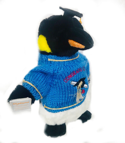 Our Penguin Graduation Plush makes for a great penguin addition for any penguin loving graduate no matter what grade he or she is graduating from. Measuring 10" tall, this plush Emperor penguin is wearing a graduation hat, hold a diploma and a blue knit sweater with an embroidered graduation hat and diploma with an actual gold tassel coming out of the hat. It also reads CONGRATULATIONS front and center. The penguin and sweater are made from all new, kid friendly materials and meets or exceeds all US safety standards. Recommended for ages 3 and up.