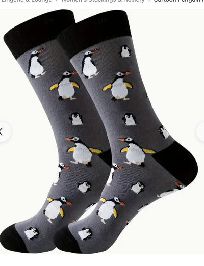 Our Gentoo penguins socks feature dozens of adorable Gentoo penguins and their chicks scattered on a deep gray background. These wonderful socks are available in a women's 9-11 size. They are 50% cotton and 50% poly blend.