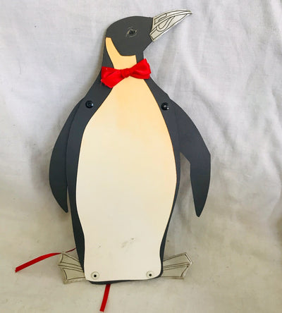 This hand crafted and painted flat penguin has hinged wings and flippers. Pull the red cord on the back and watch it dance. Cloth bow tie. Unique and very special. Signed in the back by the artist. A penguin original. Excellent condition.