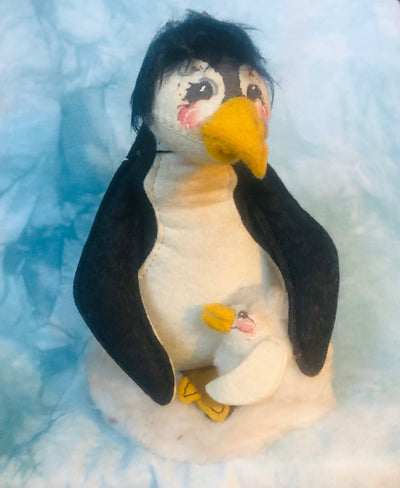 This handcrafted penguin and chick doll is the work of New Hampshire artist Annalee Thorndike. The penguin is made of multi layered fabric, felt and the doll has posable arms for imaginative fun. Vintage to 1990's. Excellent condition.