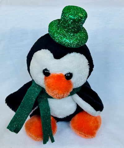 Our adorable St. Patrick's Day Plush Penguin is 6" tall and is wearing a glittery green top hat and felt green scarf. The hat is securely glued on and the little festive penguin will make a great St. Patrick's Day gift.