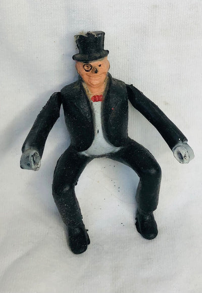 This original penguin from batman plastic figurine is in a sitting position and his movable arms have hands with holes in them meaning they were undoubtedly holding something, probably his umbrella. But, umbrella or not he'll look cool on your shelf and is very collectible and vintage to 1960's.