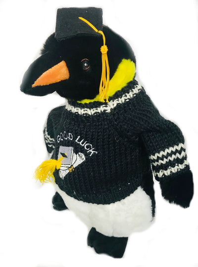 Our Emperor Penguin Graduation Plush makes for a great penguin addition for any penguin loving graduate no matter what grade you are graduating from. Measuring 10" tall, this plush penguin is wearing a graduation hat, holds a diploma, a black knit sweater with an embroidered graduation hat and diploma with an actual yellow tassel coming out of the hat. It also reads Good Luck front and center. The penguin and sweater are made from all new, kid friendly non toxic materials and meets or exceeds all US safety standards. Recommended for ages 3 and up.
