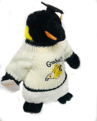 Our Penguin Chick Graduate Plush makes for a great penguin gift for any penguin loving graduate no matter what grade he or she is graduating from. Measuring 10" tall, this plush penguin chick is wearing a a graduation cap, holding a diploma and a white knit sweater with an embroidered diploma with an actual yellow tassel coming out of the sweater under the word Graduate. The penguin and sweater are made from all new, kid friendly non toxic materials and meets or exceeds all US safety standards. Recommended for ages 3 and up.