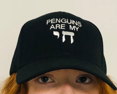 Our Penguins Are My Chai adjustable baseball hat is a perfectly fun head accessory for penguin lovers of all ages. Chai in Hebrew means Life. So the hat really says, " Penguins Are My Life in a very cool way. The hat is a sturdy and washable cotton / poly blend and only available is fashion forward black.