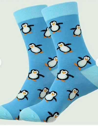 Our Penguins Waddle socks feature dozens of colorful, adorable penguins waddling all over your socks on a icy blue background. These wonderful socks are available in a women's 9-11 size. They are a long lasting poly blend.