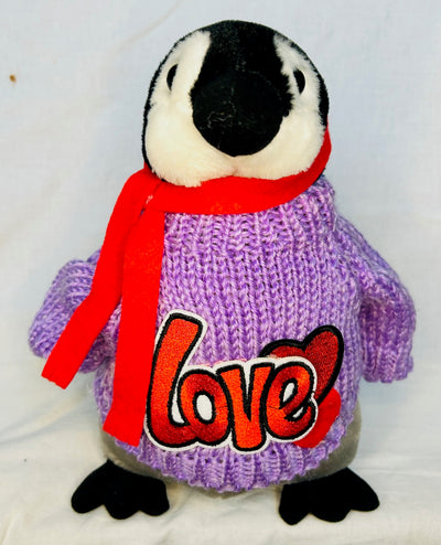Our adorable baby Emperor penguin is wearing a purple knit sweater with a red scarf. The sweater is filled with embroidered Love and Hearts. Not only is this 10" tall penguin a great way to show how you feel, but our penguin chick is also adorable with luxuriously soft, thick plush. The penguin and removable sweater are made from all new, kid friendly materials and meets or exceeds all US safety standards. Recommended for ages 3 and up.