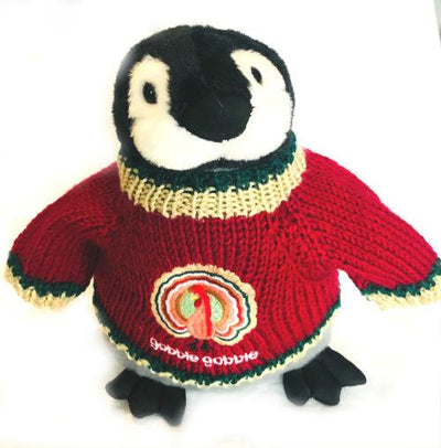 Our adorable baby penguin is wearing a red sweater embroidered with a Thanksgiving Gobble Gobble Turkey front and center. The penguin and sweater meets and exceeds all US standards for safety and materials.