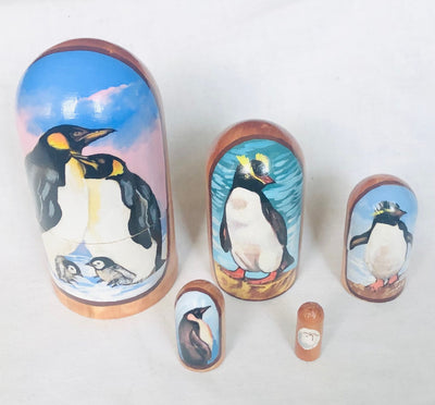 Our deluxe, medium size, five piece penguin nesting doll set is an elegant and an exquisite addition to our penguin nesting doll collection. Not only because it's so impressive and detailed, featuring Emperor and Rockhopper penguins, but because of the incredible colors, detail and artistry. The largest of these hand painted masterpieces is four inches tall and the smallest is about an inch. Each piece fits into the next largest, but this set is so wonderful you'll want to have them all out and on display. Because these are hand crafted and painted, each set is ever so slightly unique, signed and numbered by the European artist. A wonderful gift and a true penguin collectors item.