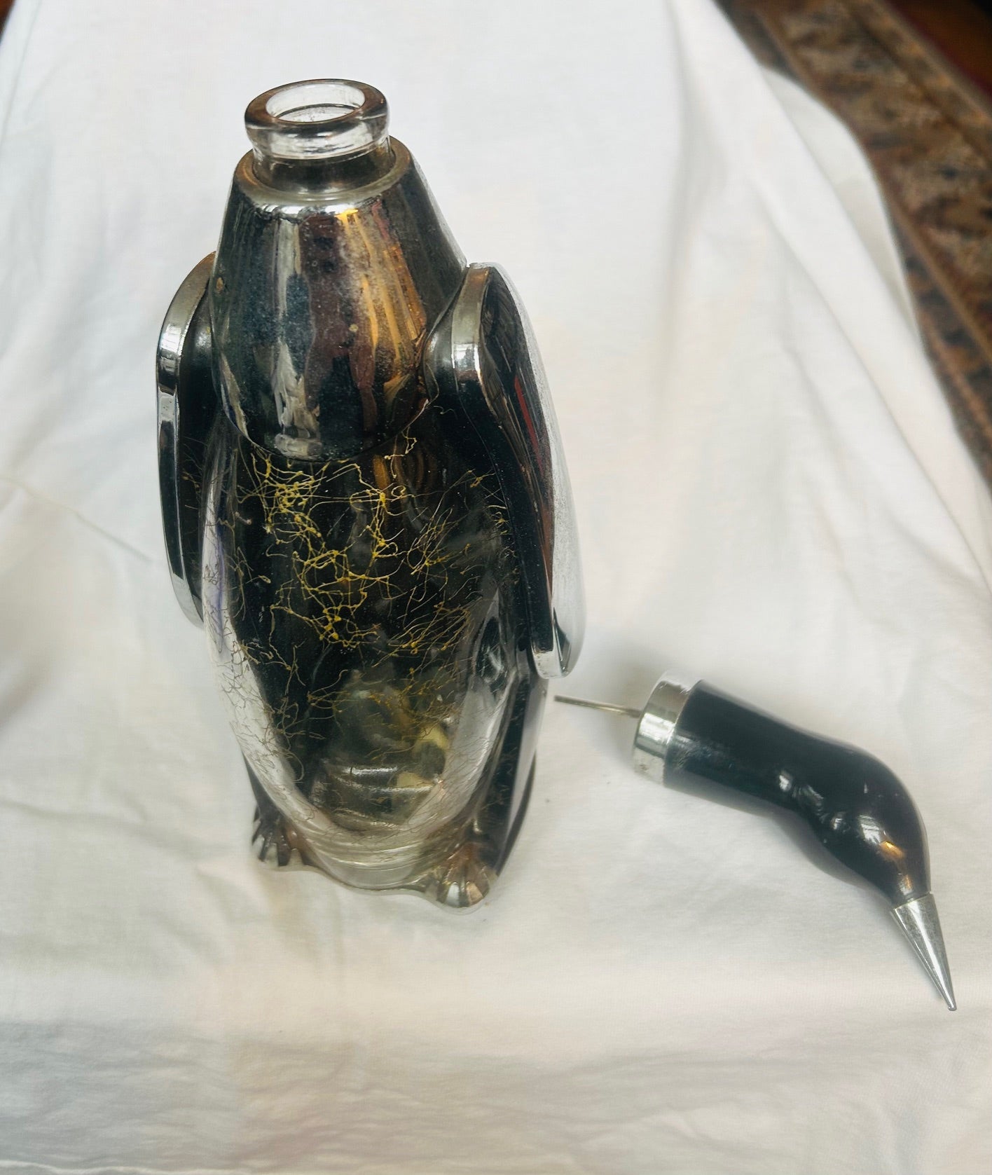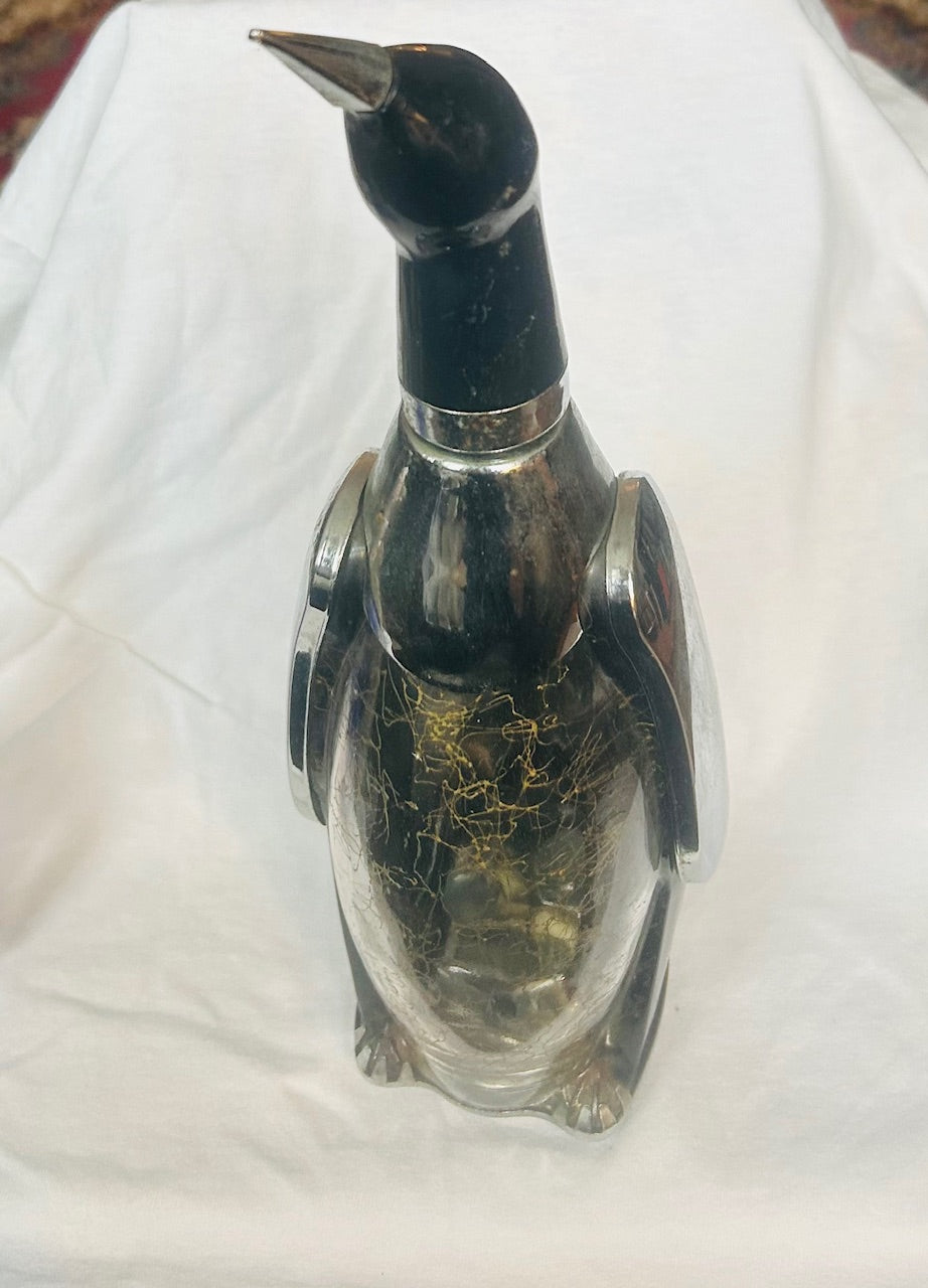 This vintage decorated glass and stainless steel penguin carafe with removable bakelite and steel head and with stork stopper. It's vintage to the 1970's. It had a wind-up music chime on the bottom, but it no longer works. A great, collectible, penguin in excellent condition.