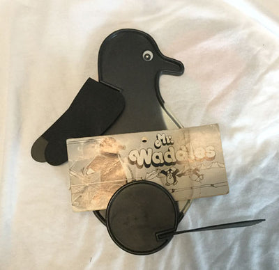 Mr. Waddles is a walking penguin on a stick classic from the 1980's. He's not been on too many walks if any and has no wear at all, and still has his original cardboard header (seen here) but he is missing his stock (a dowel at the hardware store should be easy enough) and one of his feet flippers, if you want two flapping feet, again you should be able to get a small, thin piece of black rubber at the hardware store. Other than that, this is a rare, very fun penguin collectible. He's plastic with rubber flippers and feet.