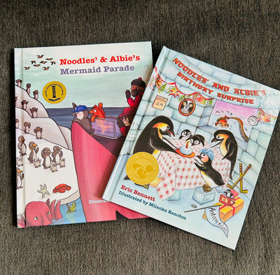 Noodles' & Albie's Birthday Surprise is the 2018 Mom's Choice Gold Award-winning fun follow-up to Noodles & Albie. With more penguins, more adventures, more illustrations, and just as fun! This hardcover, 32-page, picture book is a fun penguin tale of the further adventures of Noodles and Albie on Noodles' 1st birthday, and their hilarious day at Polar Kingdom (the world's greatest undersea amusement park), as well as their surprise encounter with a mysterious, lost, white bearded man in a red suit. This charming and imaginative story is set against a backdrop of 16 beautifully intricate watercolor illustrations that help bring the story to life. 34 pages. Hardcover 10" x 8". ( Ages 4 - 8 ) By Eric Bennett, Illustrations by Milanka Reardon.