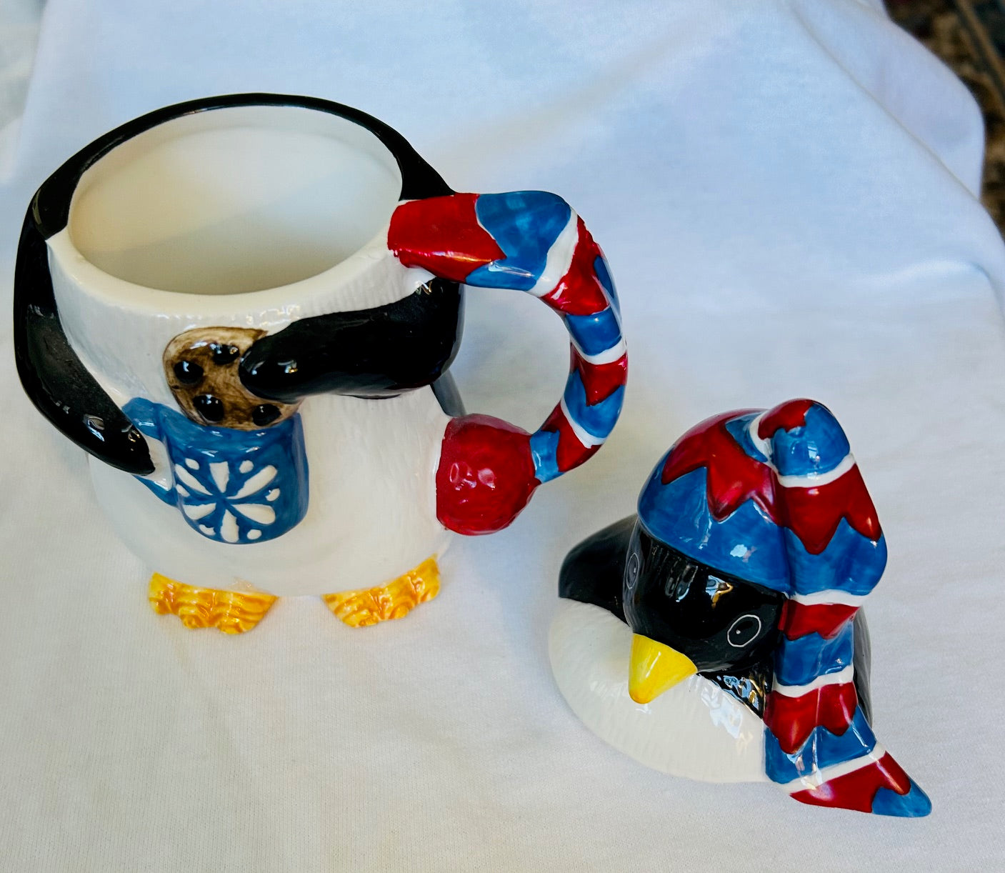 This adorable penguin cookie holder can work as a hot cocoa mug as well. It's very cute, but unfortunately, there is a damage to the back half of the handle. It looks great facing front. If you don't mind the handle damage it'll look great in your kitchen. That's why it's half price.