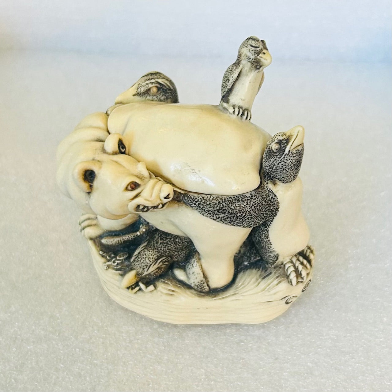 Here is a Harmony Kingdom Treasure Jest called "Murphy's Last Stand", which features a large polar bear lying on top of Murphy the Penguin. Two other penguins are trying to move the bear, while a small penguin is napping on the bear's back. The small penguin serves conveniently as a handle to open the box. Mad Murphy the Penguin is a frequent character in the Harmony Kingdom menagerie and he does tend to get into trouble. This Treasure Jest is in perfect condition, from the inventory of a closed store, and it will come in the original Harmony Kingdom green box with brochure and place card.