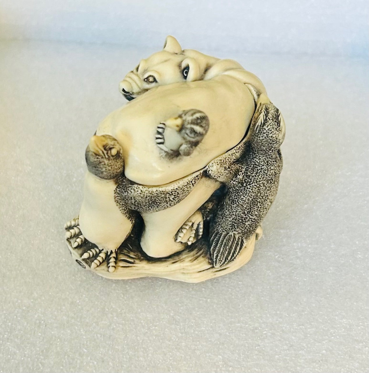In this box figurine, Murphy is in danger of being eaten by the bear. Inside of the box, there are four bottles of beer, along with the body of Murphy. Carved by artist Peter Calvesbert, this humorous box figurine has lots to offer. This Version One was released in June 1997 and was retired a few months later. An announcement was made in the collector club bulletin that a complaint had been made by the SPCA, and therefore HK decided to retire "Murphy's Last Stand" and break the moulds. Harmony Kingdom boxes are hand crafted, using marble resin, from original carvings. Then each is hand painted and tinted for a one-of-a-kind figurine. The boxes are hand painted by citizens of the rural English countryside of the South Cotswolds. There are differences in colorations on each piece.