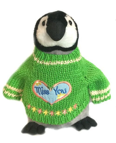 Our Miss You Penguin Plush makes for a wonderful penguin addition for a friend or family member that's far away and in your thoughts. Measuring 10" tall, this adorable plush penguin is wearing a colorful green knit sweater with an embroidered Miss You heart front and center. The penguin and sweater are made from all new, kid friendly non toxic materials and meets or exceeds all US safety standards. Recommended for ages 3 and up.