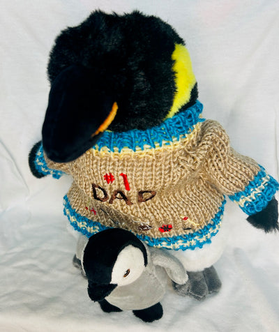 Our #1 Dad Perky Plush Penguin and chick with sweater pretty much says it all for your penguin loving dad. Perfect for your penguin loving dad for birthdays, Father's Day or any time you want to show dad how much you care about him. The 11" tall Penguin & attached chick plush is wearing a removable knit sweater with #1 Dad embroidered front and center. To top it off our 11" tall penguin plush is not only soft and adorable, but cuddly and cute as well, and is made from high quality, all new kid safe materials Both the penguin and sweater meet or exceed all U.S. and European safety and material standards, and the sweater is a durable acrylic cable knit.