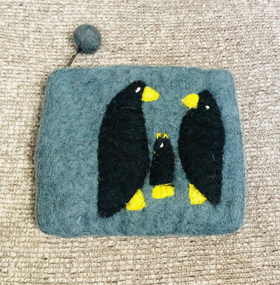 This adorable hand-crafted wool and felt penguin zip up travel purse is a great way to carry your sugar / Spenda packets, tea bags, pills, change or what have you.  It's small enough to fit nicely in a backpack or purse, but perfect for your bare essentials on the road. The purse is 100% wool and the penguins are hand stitched felt.  Secure zipper wrap around enclosure makes it penguin perfect. 5" x 4"