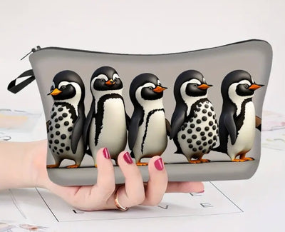 Our very cool Penguin Line-Up hand purse, travel pouch, makeup bag, is also penguin perfect for your phone or school. Lightweight and waterproof polyester, this fun penguin line-up is printed on both sides. Washable and durable.