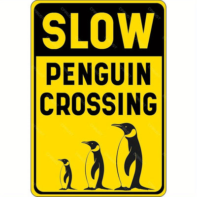 This fun, Indoor / Outdoor, Slow - Penguin Crossing sign will look great in your home, office, dorm or on your lawn or yard. Penguin Perfect fun and a nice size 12" x 7" aluminum with four corner holes for easy mounting.