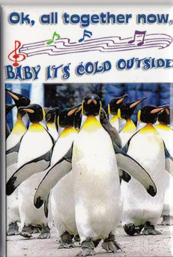 This group of Emperor Penguins on ice look like they're ready for a parade in this fun 2" x 3" magnet that reads between the musical notes, "OK, all together now" on one line and "Baby It's Cold Outside" on the next. . The image is sealed and is virtually scratch resistant on metal and the entire back is the magnet for a secure and strong attachment to any metallic surface.