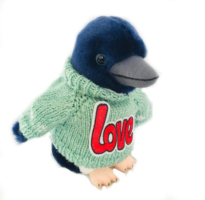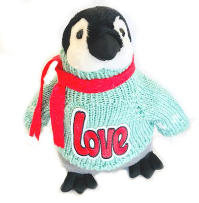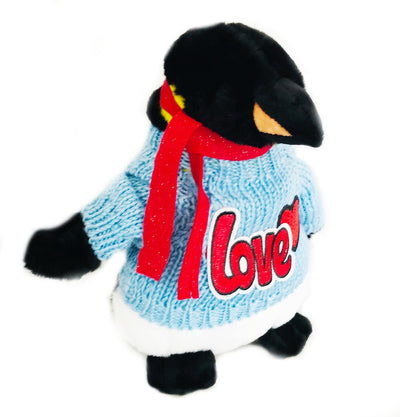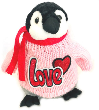 Our adorable Valentine Emperor penguin is wearing a blue knit sweater with a red glittery scarf. The sweater has an embroidered Love and romantic Hearts. Not only is this 10" tall penguin a great way to show how you feel, but our penguin is also adorable with luxuriously soft, thick plush. The penguin and removable sweater are made from all new, kid friendly materials and meets or exceeds all US safety standards. Recommended for ages 3 and up.