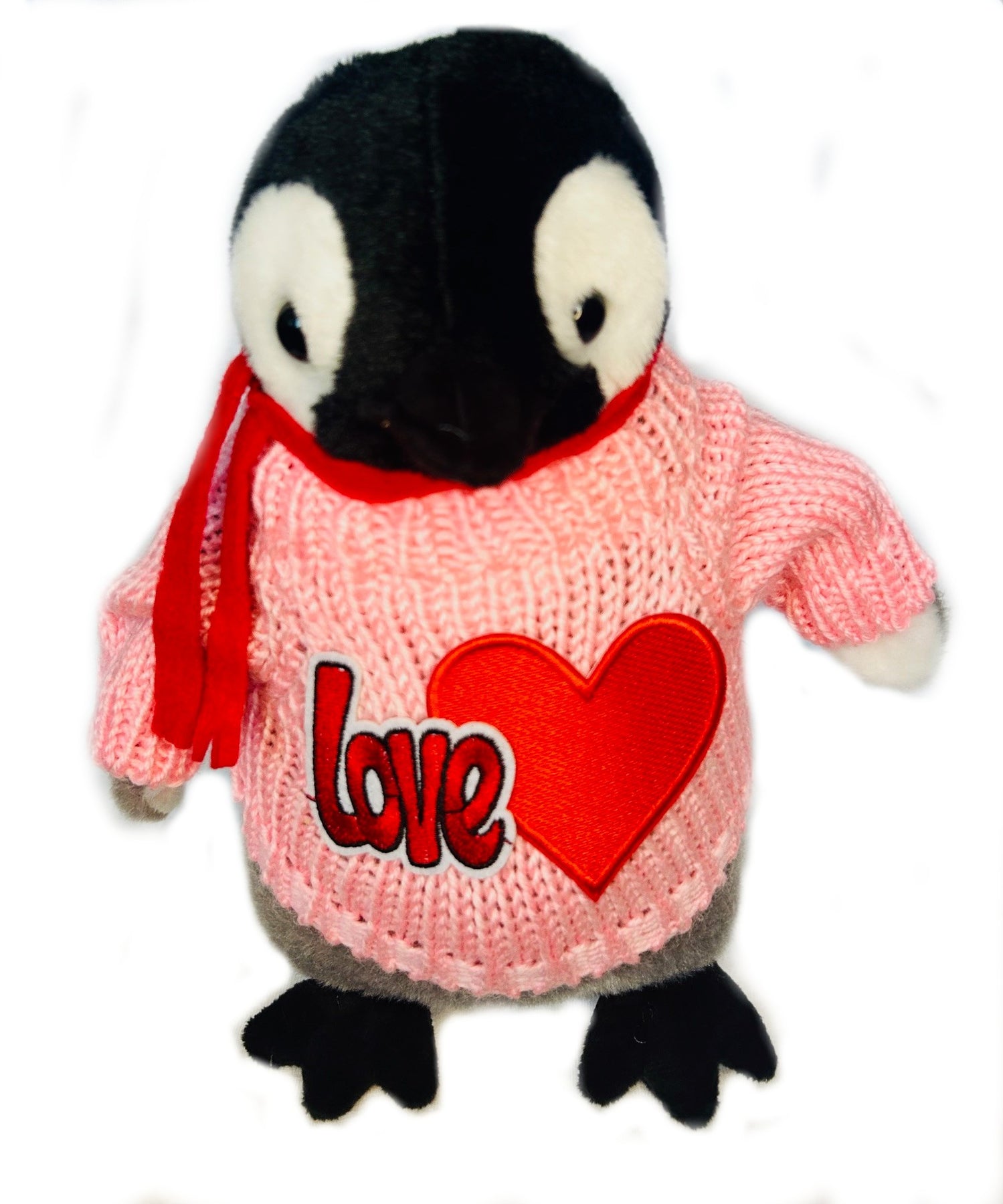 Our adorable baby Emperor penguin is wearing a pink knit sweater with a red scarf. The sweater is filled with embroidered Love and Heart. Not only is this 11" tall penguin a great way to show how you feel, but our penguin chick is also adorable with luxuriously soft, thick plush. The penguin and removable sweater are made from all new, kid friendly materials and meets or exceeds all US safety standards. Recommended for ages 3 and up.