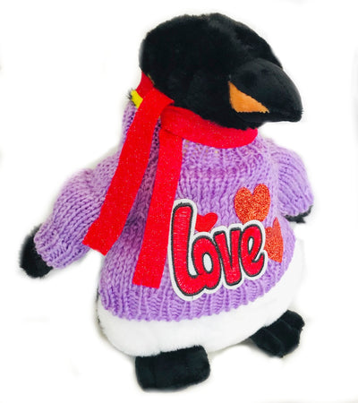 Our adorable baby Emperor penguin is wearing a blue knit sweater with a red glittery scarf. The sweater is filled with embroidered Love and Hearts. Not only is this 10" tall penguin a great way to show how you feel, but our penguin chick is also adorable with luxuriously soft, thick plush. The penguin and removable sweater are made from all new, kid friendly materials and meets or exceeds all US safety standards. Recommended for ages 3 and up.