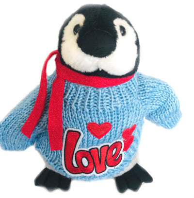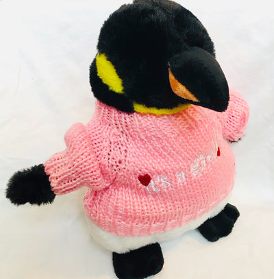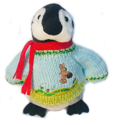 Our Happy Easter Plush Penguin Chick makes for a fun way to celebrate the holiday without a bunny in penguin style. Measuring 10" tall, this plush penguin chick is wearing a colorful knit cotton pull-on sweater that reads "Hoppin' Down The Bunny Trail" with a cute hopping bunny carrying an Easter Basket. Not only is the sweater and festive red scarf perfect for the occasion, but our penguin plush adorable. The penguin features ultra soft stuffing and luxuriously soft, thick plush fabric. The penguin and sweater is made from all new, kid friendly materials and meets or exceeds all US safety standards. Recommended for ages 3 and up.