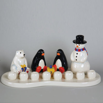 This unique ceramic Antarctic (penguins) meets the Arctic (polar bears) Menorah that even includes a Snowman along with a pair of Penguins, and Polar Bears is sure to be a big holiday hit. There's even a ceramic Dreidle between the penguins. It's a solid ceramic and hand painted.